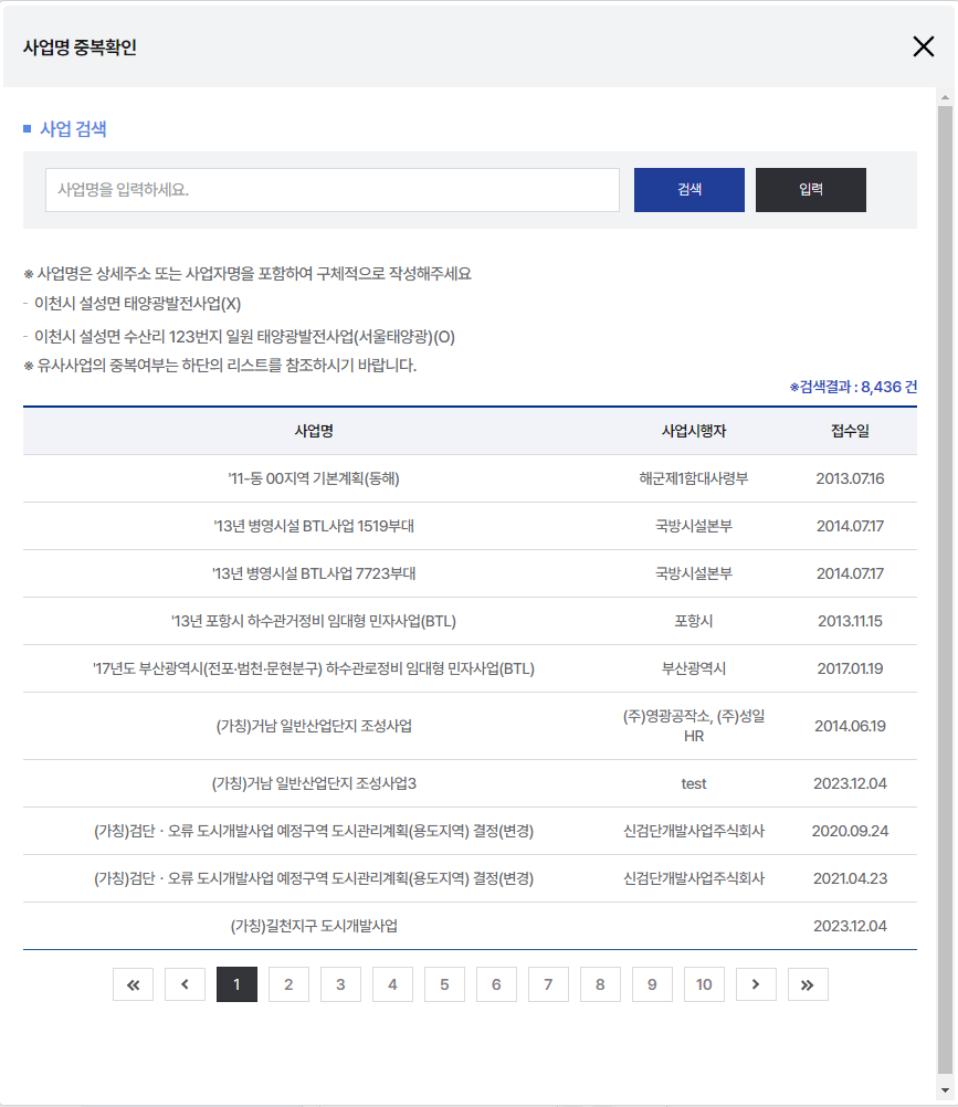 2사업명 입력 후 검색 버튼을 눌러 중복 확인 후 입력 버튼을 클릭합니다
