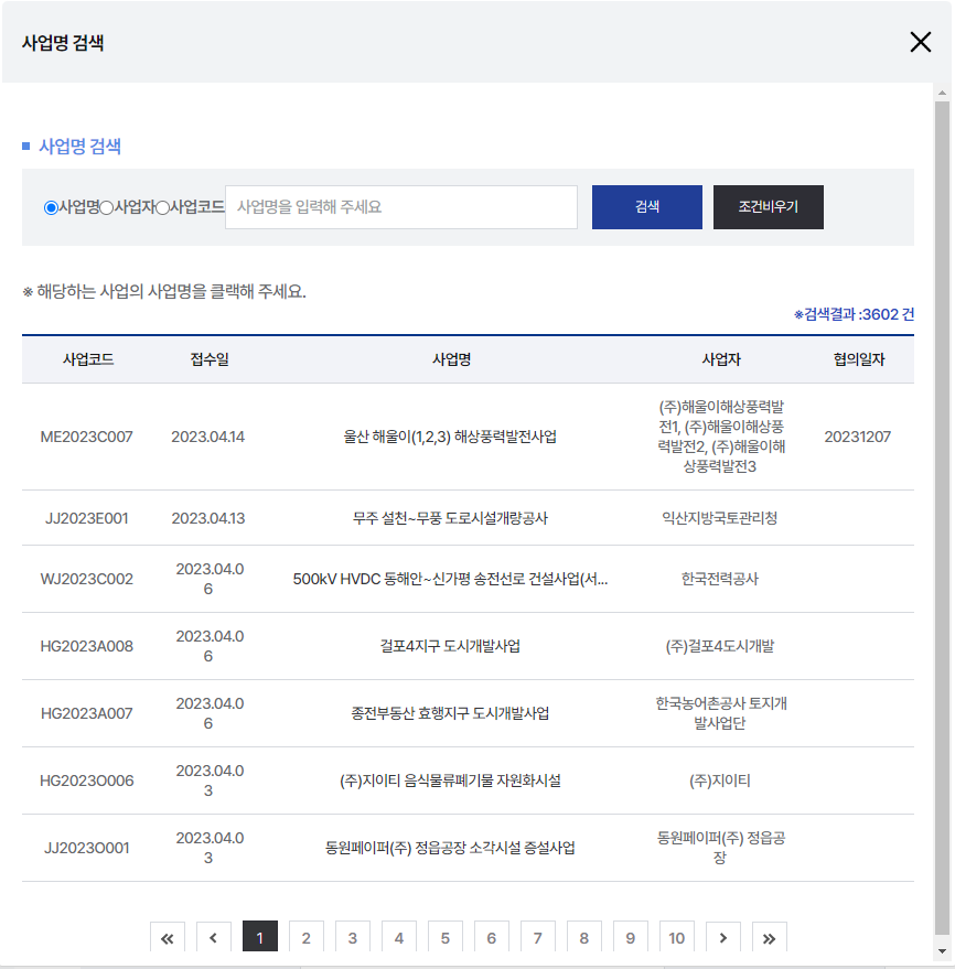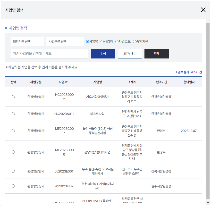 3사업명, 협의일자 등을 참고하여 해당 사업 선택 후 연계버튼을 클릭합니다. (사업명이 일부 수정된 경우, 공구가 나누어진 경우 등은 사업명이 수정 가능합니다.)