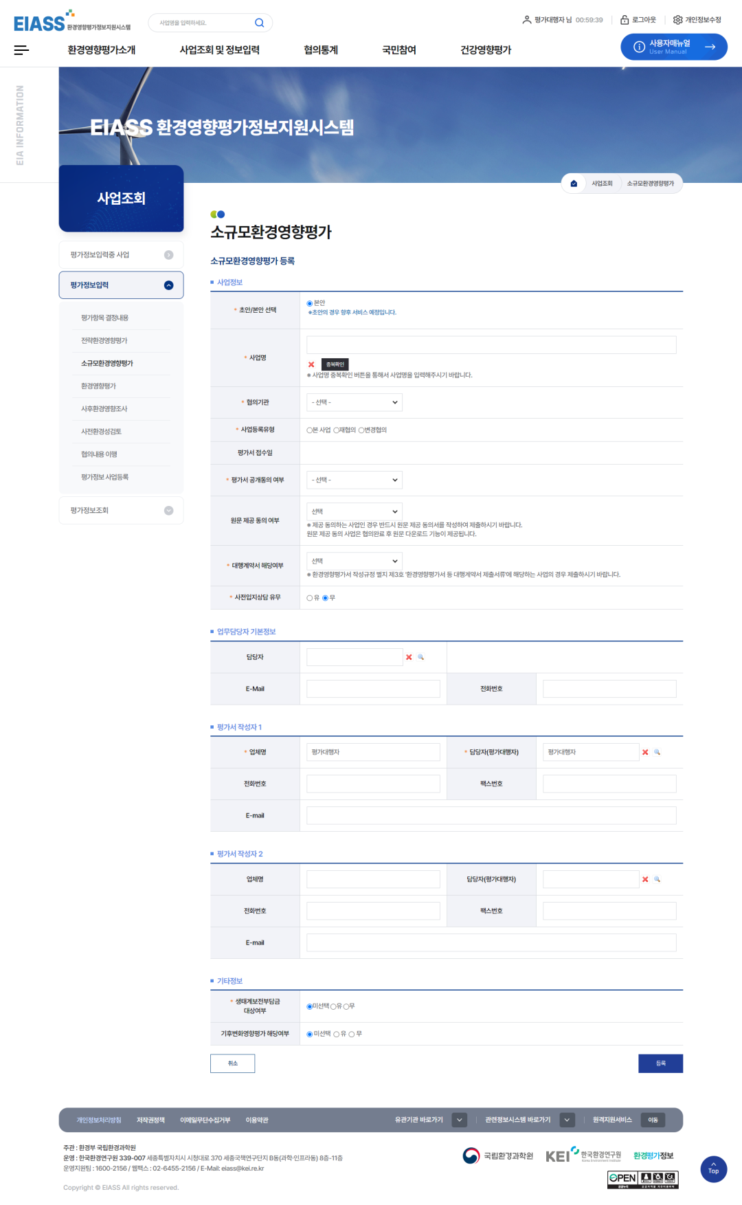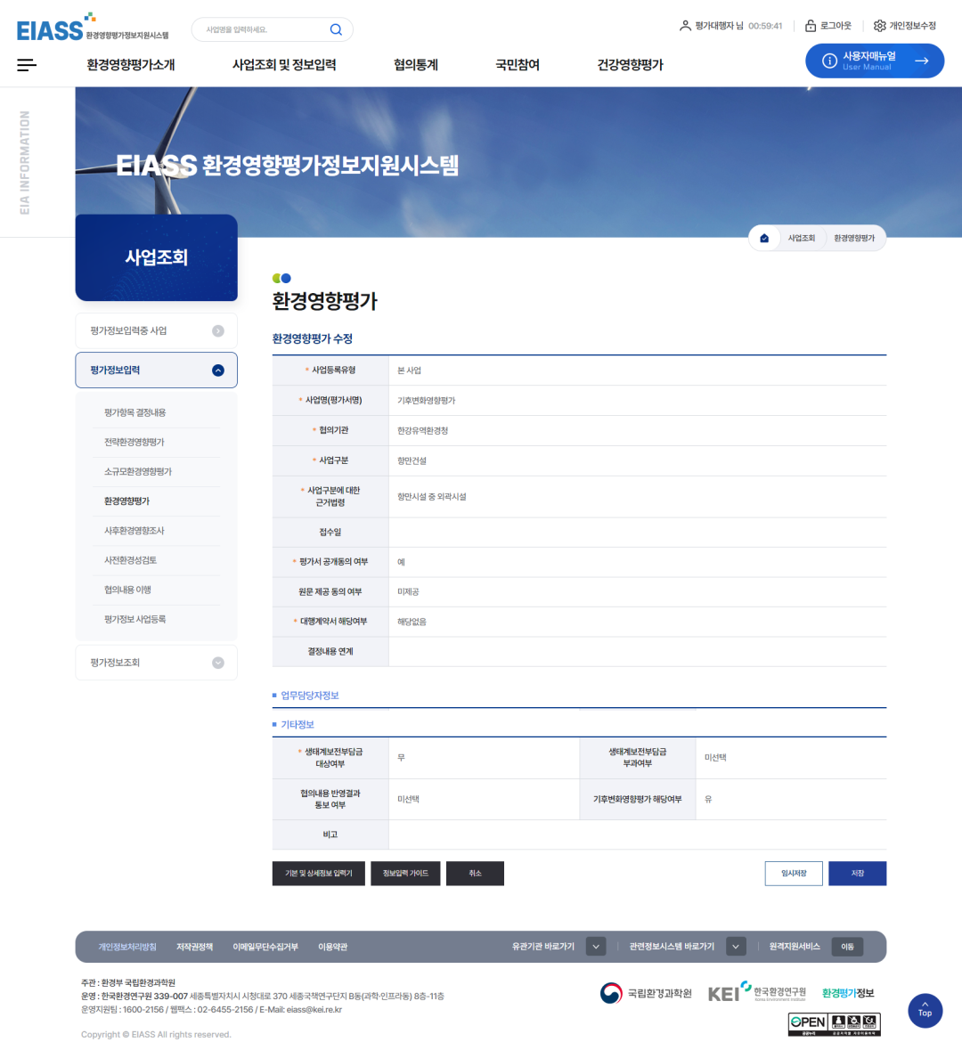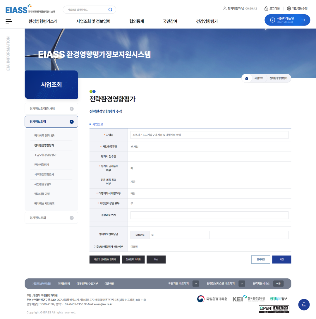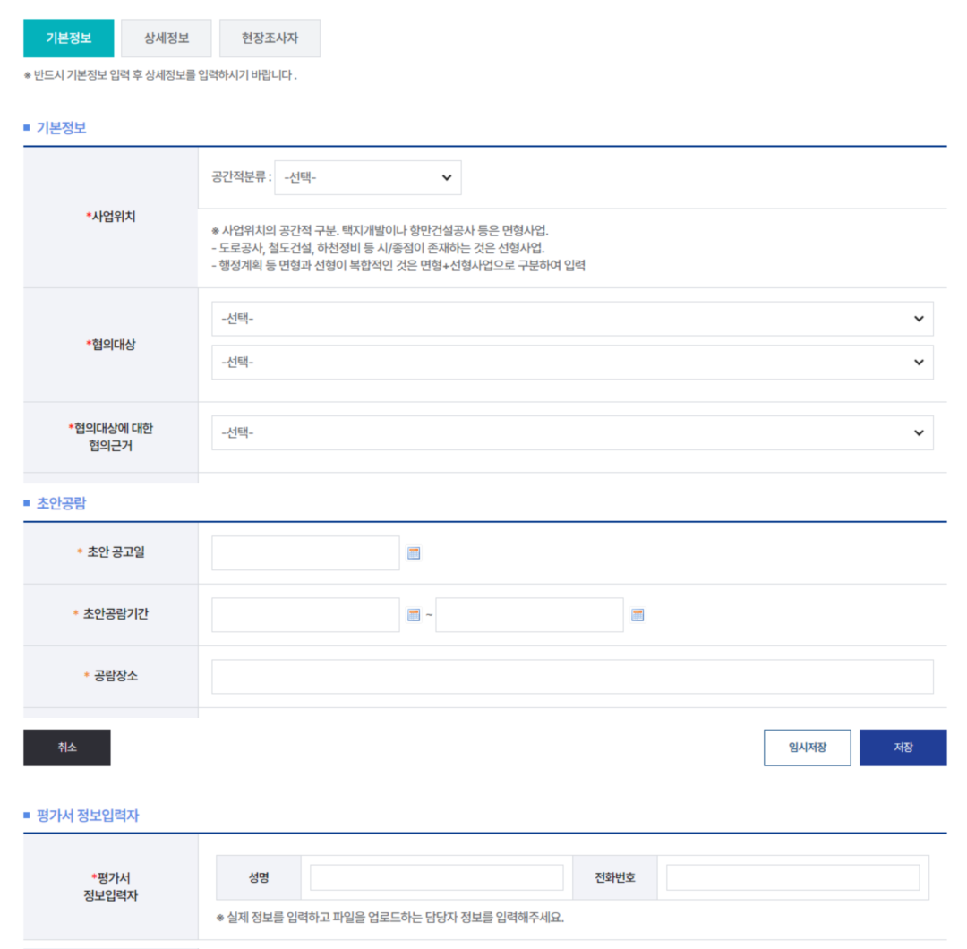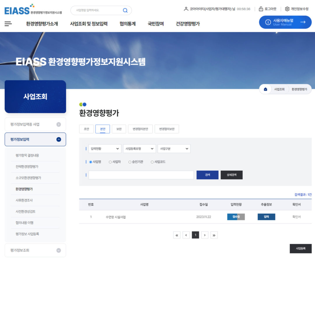 2환경영향평가 추출정보입력기 버튼을 클릭하여 추출정보를 입력합니다. (사업추진경위부터 평가참여자까지 보고서에 수록된 내용은 모두 입력합니다.)