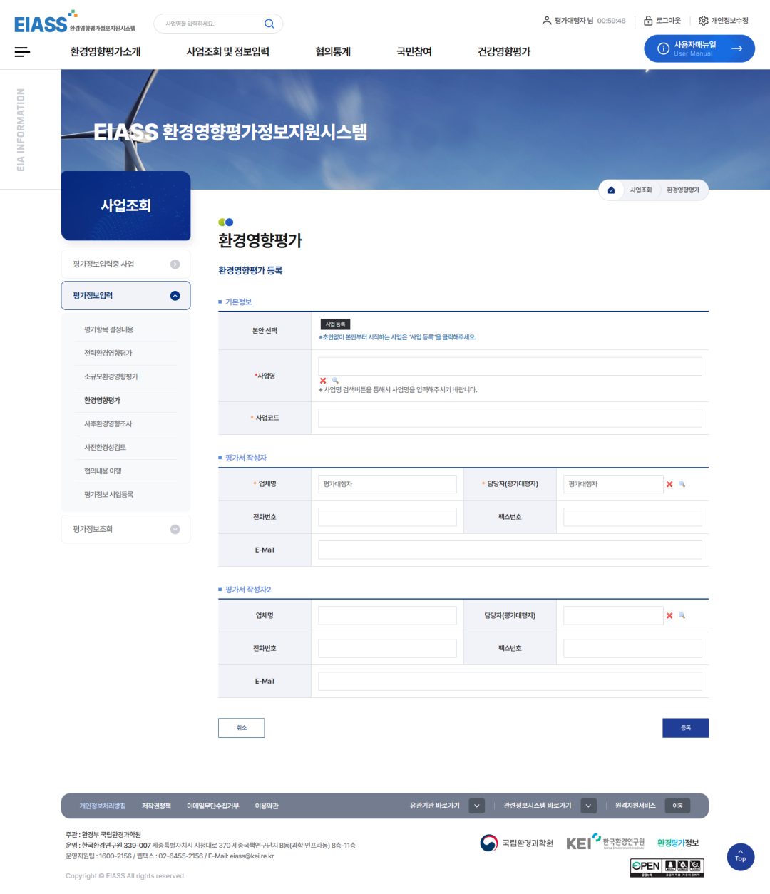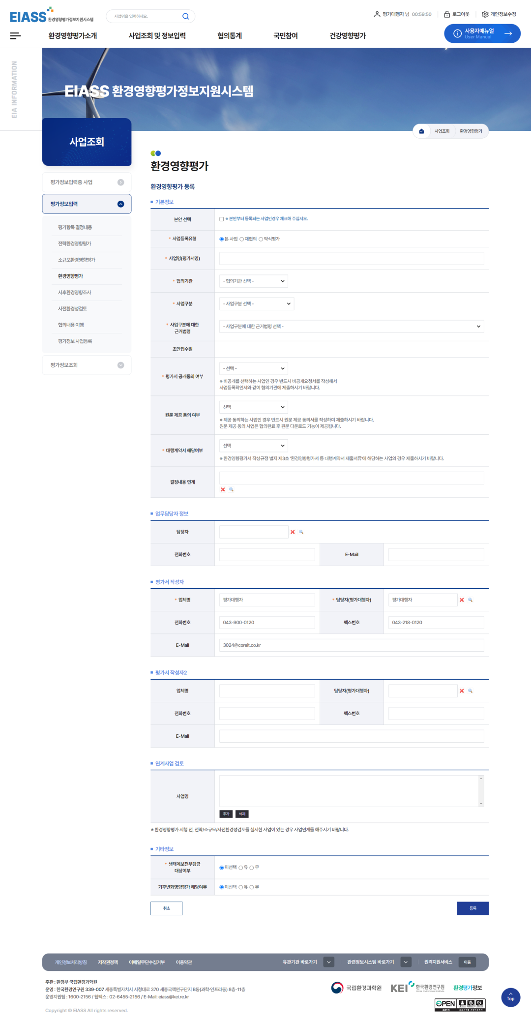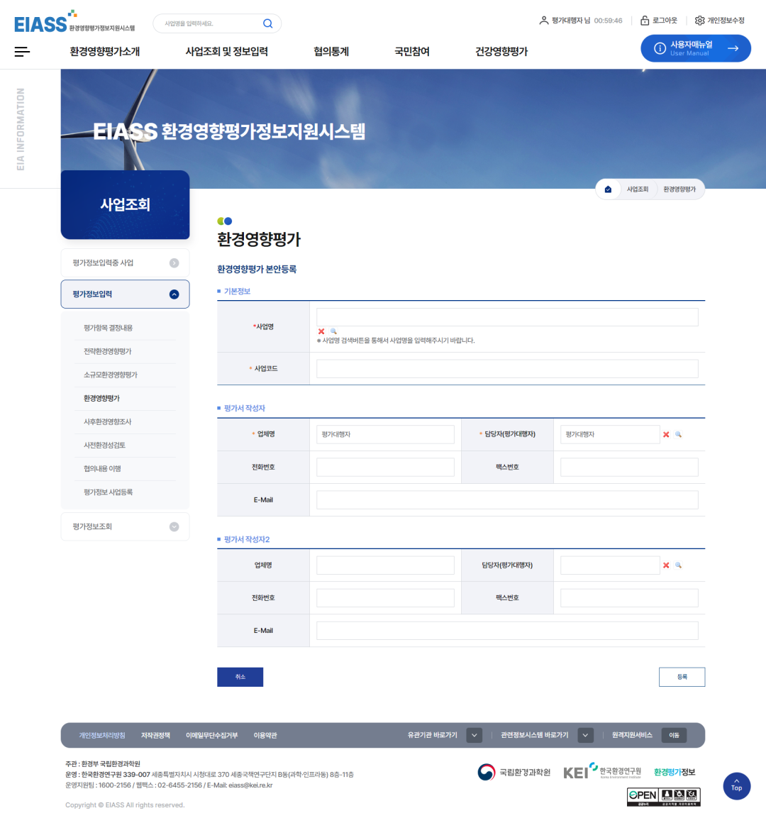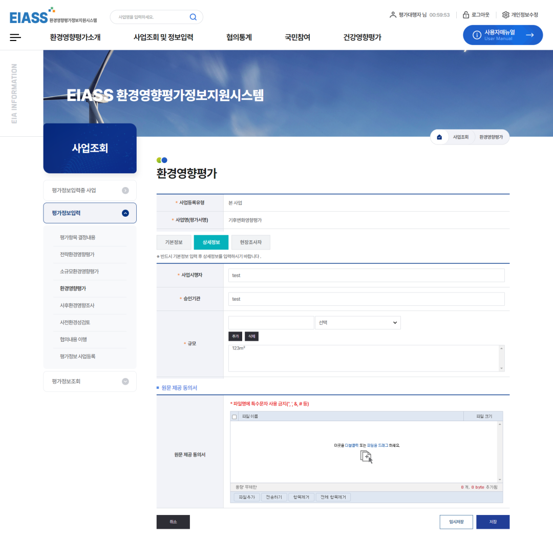 2환경영향평가 추출정보입력기 버튼을 클릭하여 추출정보를 입력합니다. (사업추진경위부터 평가참여자까지 보고서에 수록된 내용은 모두 입력합니다.)